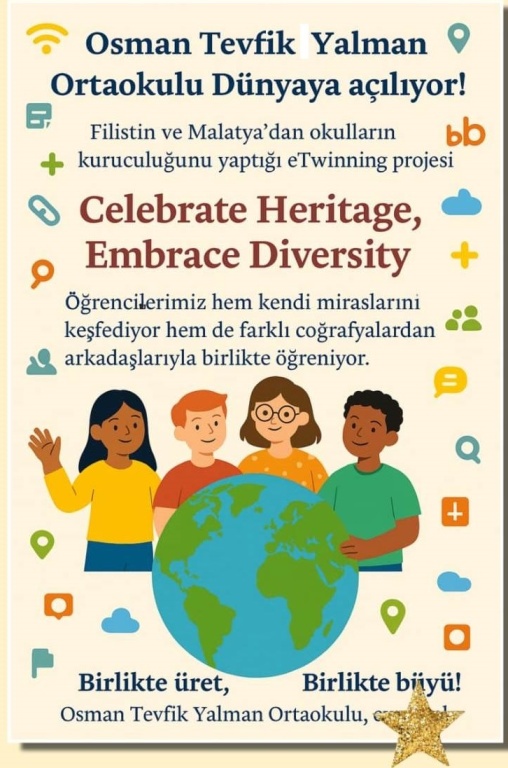 Okulumuz, Filistin ve Malatya’dan okulların kuruculuğunu üstlendiği uluslararası eTwinning projesi “Celebrate Heritage, Embrace Diversity” (Mirası Kutla, Çeşitliliği Kucakla) ile farklı kültürlerden öğrenci ve öğretmenlerle bir araya gelerek büyük bir başarıya imza atıyor.